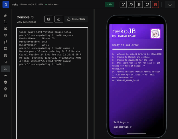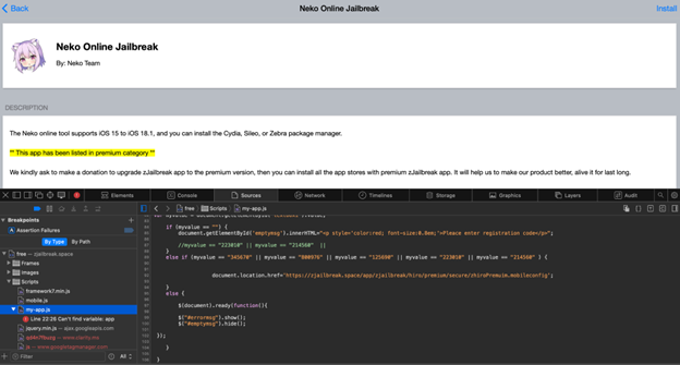 Using a Corellium iPhone 16e running iOS 18.5 and Safari Web Inspector on macOS 15.6, our research team analyzed every step of the so-called jailbreak. What we found wasn’t a jailbreak at all—but a well-disguised scam engineered to harvest trust, traffic, and possibly credentials.