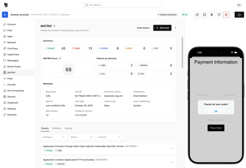 With support for iOS 26, the latest iPhone 17 models, and dynamic MATRIX risk scoring, 7.7 introduces functionality you won’t find in any other platform. Request a meeting with Corellium to start testing today.
